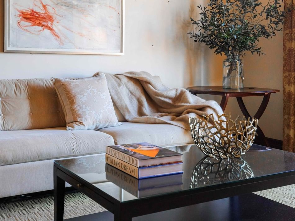 An 825 sq. ft. spacious one bedroom suite with private bedroom featuring two full beds. Includes living area and kitchen equipped with a mini-fridge, stovetop, microwave and sink. Each room is outfitted with luxurious Santa Maria Novella toiletries, premium 300-thread count Rivolta Carmignani linens, and plush Kassatex bathrobes.